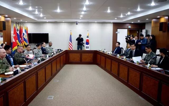 2016年3月4日,韩国首尔,为讨论驻韩美军部署“萨德”系统事宜,韩美成立联合工作组。图为联合工作组的韩方首席代表、国防部政策企划官张庆洙少将(右二)与美方首席代表、韩美联合司令部企划参谋本部长罗伯特·海德伦德少将(左三)在韩国国防部举行会谈。
