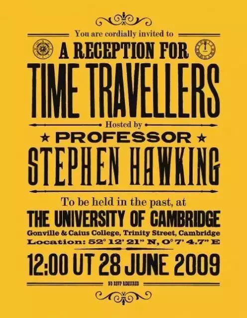2009年6月,霍金特地为“时间旅行者”举办了一场的派对。有趣的是,派对的请柬是在派对结束一年后才发出的,所以只有来自“未来”的时间旅行者才能知道这次聚会的举办地和时间。