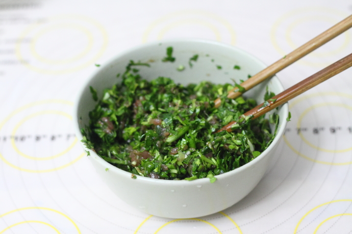 5、荠菜剁碎后加入肉馅中搅拌均匀,再滴入少许油和盐拌均匀