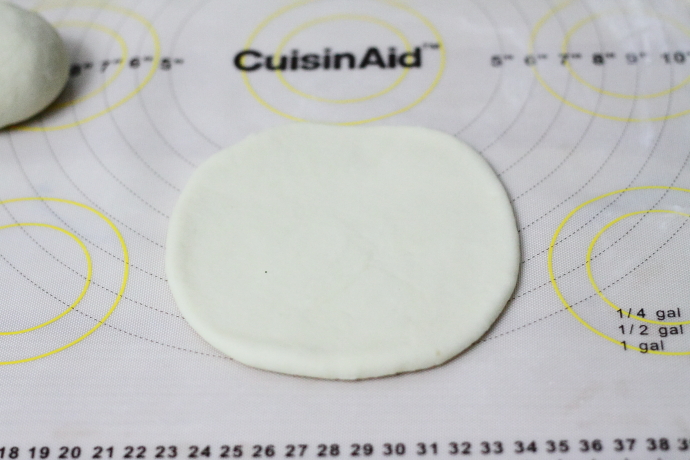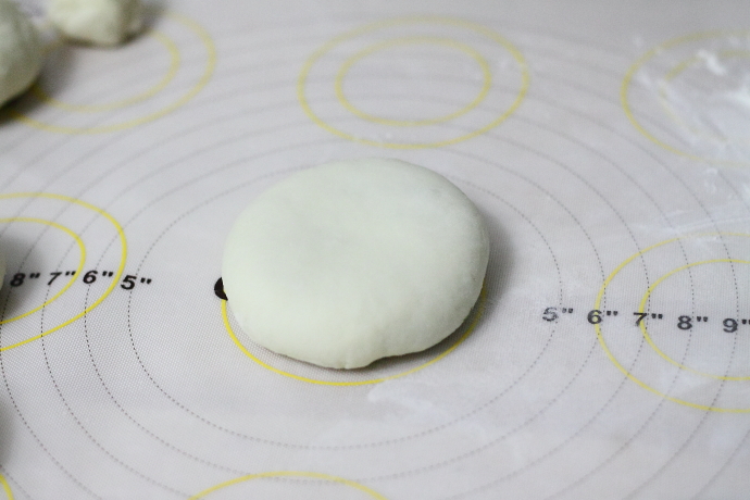 10、收口面朝下放在面板上,用手或擀面杖轻轻做成圆饼