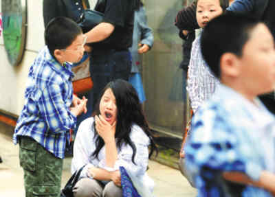 一名还没睡醒的年轻母亲蹲在地上打起了哈欠。(贾同军摄)