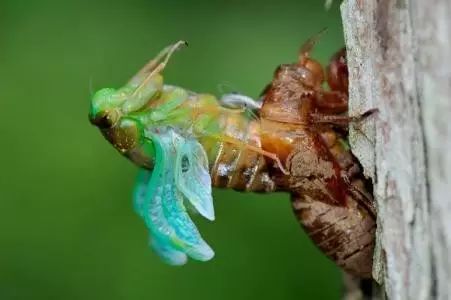 当蝉蛹的背上出现一条黑色的裂缝时,蜕皮的过程就开始了,蝉蛹的前腿呈勾状,这样,当成虫从空壳中出来时,它就可以牢牢地挂在树上。蝉蛹必须垂直面对树身,这一点非常重要。这是为了成虫两翅的正常发育,否则翅膀就会发育畸形。