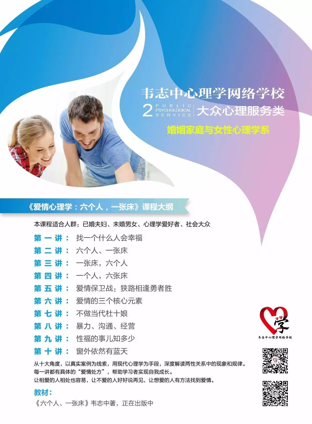 一张床六个人,这成何体统?那不乱套了嘛!其实,这是爱情心理学“三菜一汤”的“一道菜”。咱们爱情心理学有四门课即“三菜一汤”,分别是:《性心理学》、《爱情心理学:六个人一张床》——就是这门解读爱情的心理原理的课、《民歌中的爱情心理学》和《婚姻家庭治疗技术》,“一汤”指的是《性心理学》。