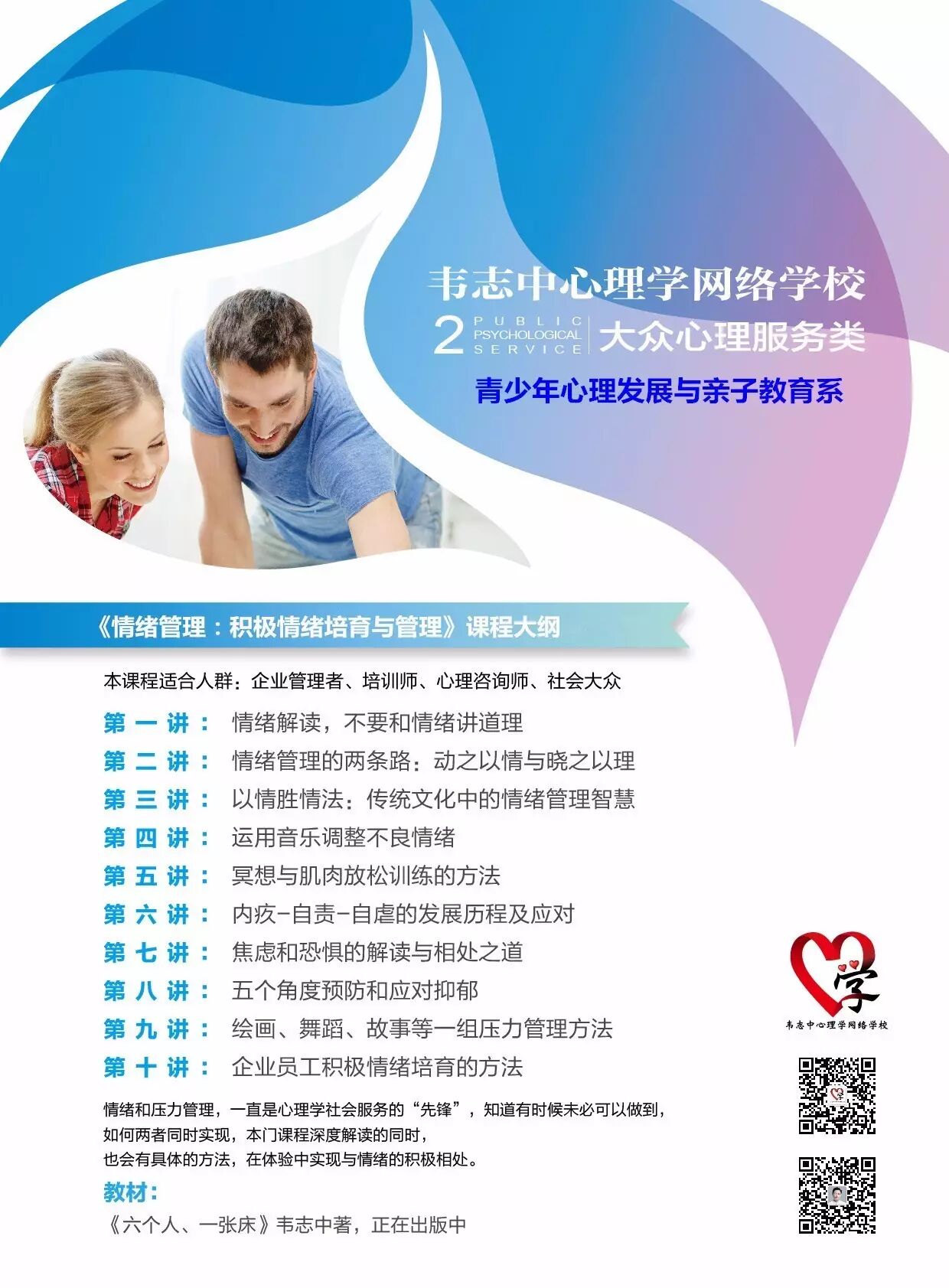 今天我给大家介绍的课程是《积极情绪培育与管理》。情绪管理和压力应对是我们心理学应用到企业、社会中比较普遍性的一个专业方向。这是放在青少年心理发展和亲子教育系里的一门课程。