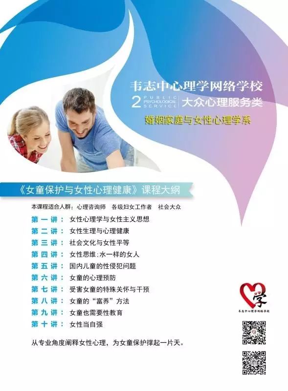 《女童保护与女性心理健康》是婚姻家庭女性心理学系的一门课程,是以女性心理学、女性主义思想指导下的对女性心理健康管理的课程。我相信广大的女性同胞们会从这门课程中受益,未来我们网校也会沿着这条路,专门成立女性心理学系,这是我们努力的一个方向。