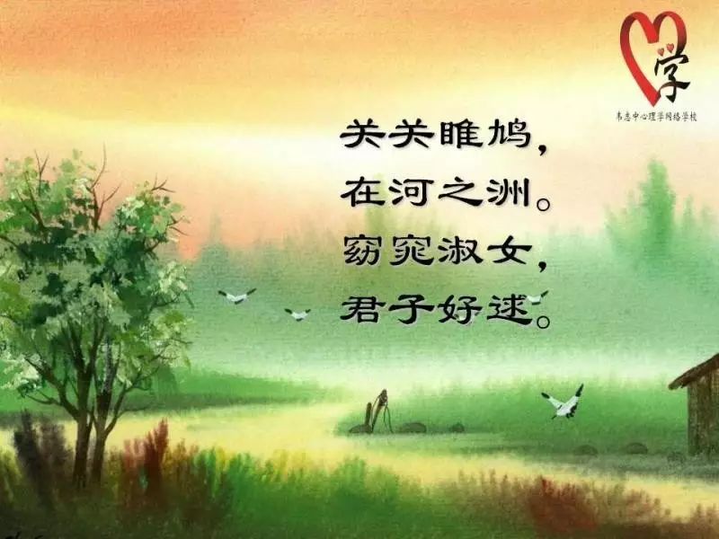 后边两句是特别有意思的,“窈窕淑女,君子好逑”。前面两句讲的是鸬鹚捕鱼,在远的地方有一条河。河分叉了,中间正好有一个洲。那个洲上面,鸬鹚在呱呱地叫。关关的意思是呱呱叫的意思,呱呱叫的鸬鹚等着要下水捕鱼了。