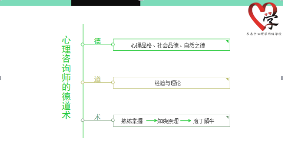 大家要注意,可能这里面有一个理解的误区。我刚才已经说过,不是我“德”“道”“术”修不好,我就不能去做咨询,不是的。是心理咨询师的工作,是实践的工作。我们一定要在“事上练”,这是王阳明先生说的。为什么我把网校的标志定为“心学”呢?“心学”,就是中国人的心理学;“心学”,就是“事上练”、“知行合一”、“致良知”,就是这三方面的工作。“事上练”,就是你不断地去做事,在实践中磨练你的。“致良知”,就是我们要永远追求善的方向,我们心理的资本不断的强大,做一个好人。“知行合一”,就是你外部和内部,你的行为和思想完全统一。就这三个工作。王阳明“心学”的三位一体,结合我们刚才讲的“德”、“道”、“术”,你就可能会成为好的咨询师了。