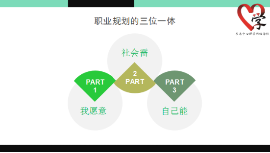 下面我们看职业规划的三位一体。时间真是过得太快了,突然发现我想说的太多了,现在已经44分钟了。职业规划的三位一体我们是一定要知道的:就是我愿意,社会需,自己能。