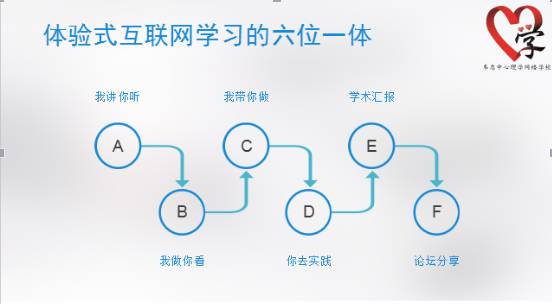 第一个角度是听别人讲,好的老师在网上讲好的课程,该购买就购买;第二个角度是你看别人做,比如现在我网上的课,有三分之一的课是我直接现场做,你可以看;第三个角度是别人带着你去做,你跟着别人做,比如老师在网课上说下面把纸拿出来,咱们画一个自画像,你就按照他说的做。第四个角度就是你要去实践,一定要去实践,学了东西一定要去用;第五个角度是要汇报、要总结,网校就是地面有教学点,教学点就是在一起做总结,我学的东西用在孩子身上,用在学生身上,用在我自己身上了吗?第六个角度就是要在论坛上分享。这就是网校教育教学的六位一体。