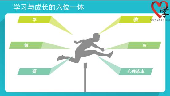 你看我在这里讲,不知道大家有没有明白,我是明白了,那就是把自己教明白了。“学、做、研、教、写”,写就是你自己能倒出来,不是酒壶煮饺子倒不出来。这五个“学、做、研、教、写”再加一个个人的心理资本建设、个人成长就是六位一体。这六个因时间关系,不能给大家详细地去讲。今天我是拿出来了最干最干的货给大家。