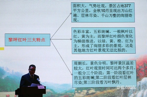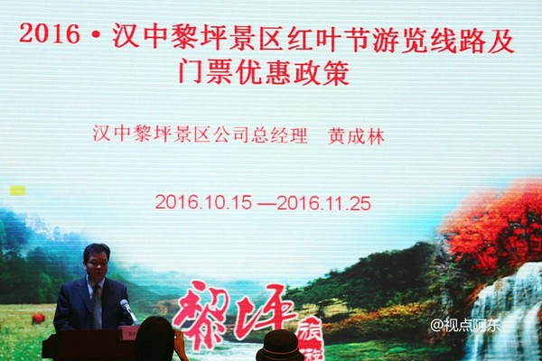 2016汉中黎坪景区红叶节新闻发布会由汉中市旅游协会、南郑县人民政府主办,汉中黎坪景区管委会、汉中黎坪景区开发建设有限公司承办。发布会由汉中黎坪景区公司副总经理郝战琪主持。会上,南郑县人民政府副县长丁涛致欢迎辞,汉中黎坪景区管委会主任聂世强介绍了黎坪景区近几年的发展情况,黎坪景区公司总经理黄成林发布了黎坪景区红叶节活动及门票优惠政策。