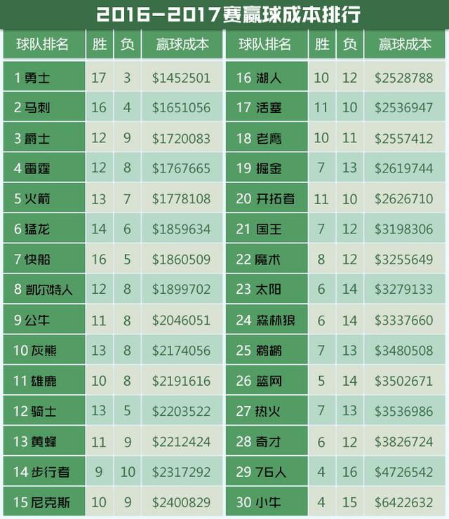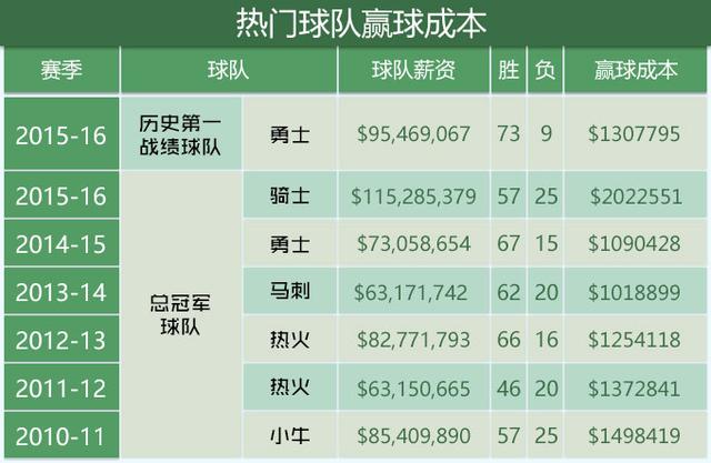 赢球成本=(单场比赛成本*比赛场次)/赢球场次,其中单场比赛成本=球队薪资/82。