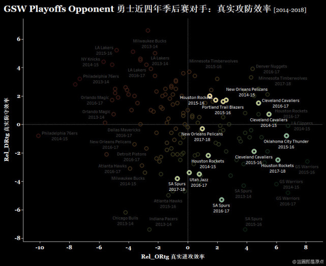 下图是2014-2018四个赛季常规赛的真实攻防效率,勇士的对手已经被加亮。其中横轴代表进攻,越靠右则进攻更加出色;纵轴代表球队的防守,越靠下则防守更加出色。两条虚线代表联盟的平均值。
