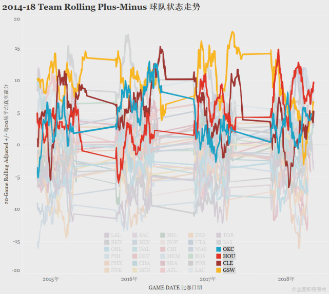 从图中,我们可以看出,在2015年和2017年勇士夺冠的两年,他们的走势都是一路高歌猛进,拉开联盟其他球队相当一段距离,最终夺得冠军。而在丢掉冠军的2016年,勇士从图表上来看的优势并不明显,一度被雷霆和骑士压制。那个赛季,勇士也最终丢掉总冠军。