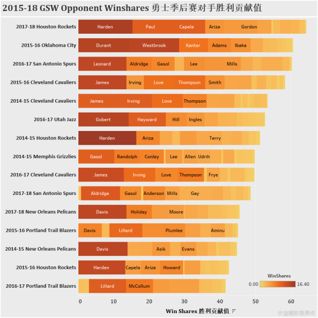 首先我们要说明一点,WS值本身已经不是基础的数据累积,而是在经过计算之后得出的高阶数据,体现了一个球员在团队中的价值。来看看勇士最近四年季后赛对手中除火箭外最强的四支球队,2015-2016赛季的雷霆,2016-2017赛季的马刺,2015-2016赛季的骑士,2014-2015赛季的骑士。