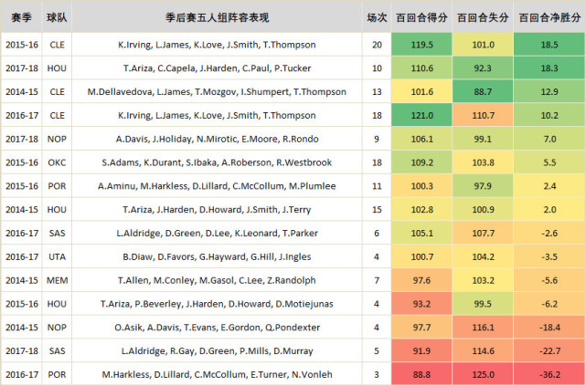 下图是勇士最近四年内季后赛对手当赛季首发五人组的效率,分为百回合得分,百回合失分和百回合净胜分三项。