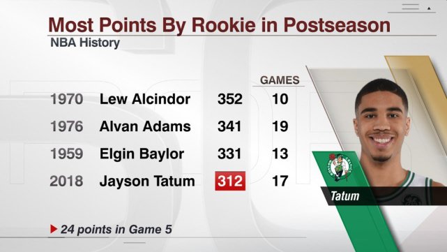 塔图姆在本赛季季后赛中已拿到312分,他成为历史上第六位在新秀赛季季后赛中拿到至少300分的球员。上一位做到这一点的新秀是1977-78赛季的杰克-希克马(301分),其他四人分别是阿尔万-亚当斯(341分)、卡里姆-阿卜杜尔-贾巴尔(352分)、埃尔金-贝勒(331分)、乔治-麦肯(303分)。