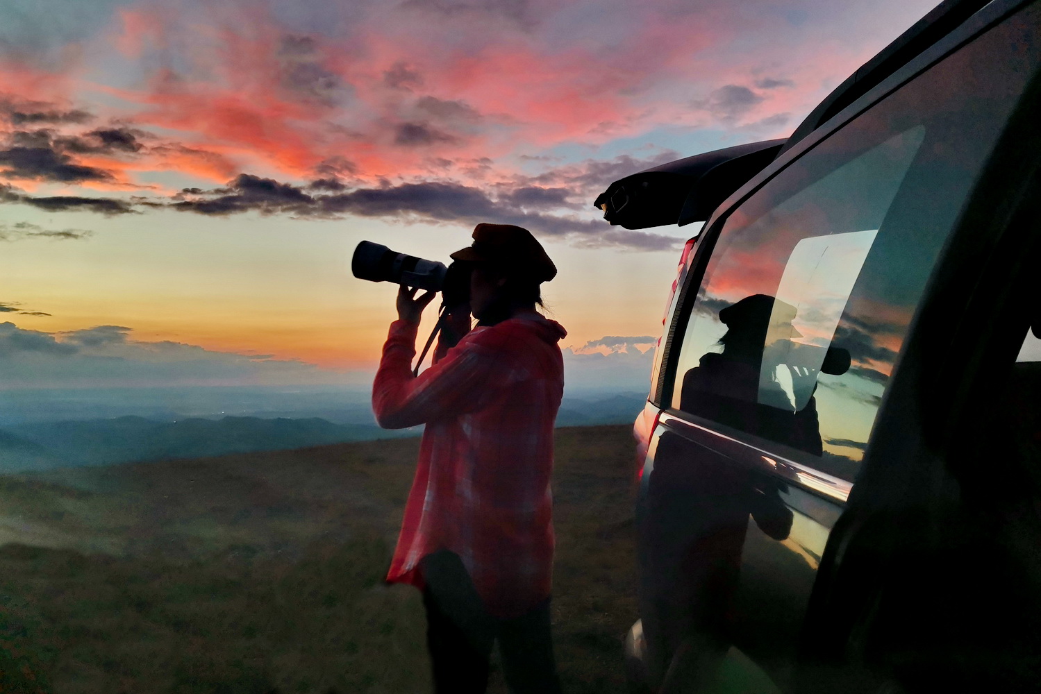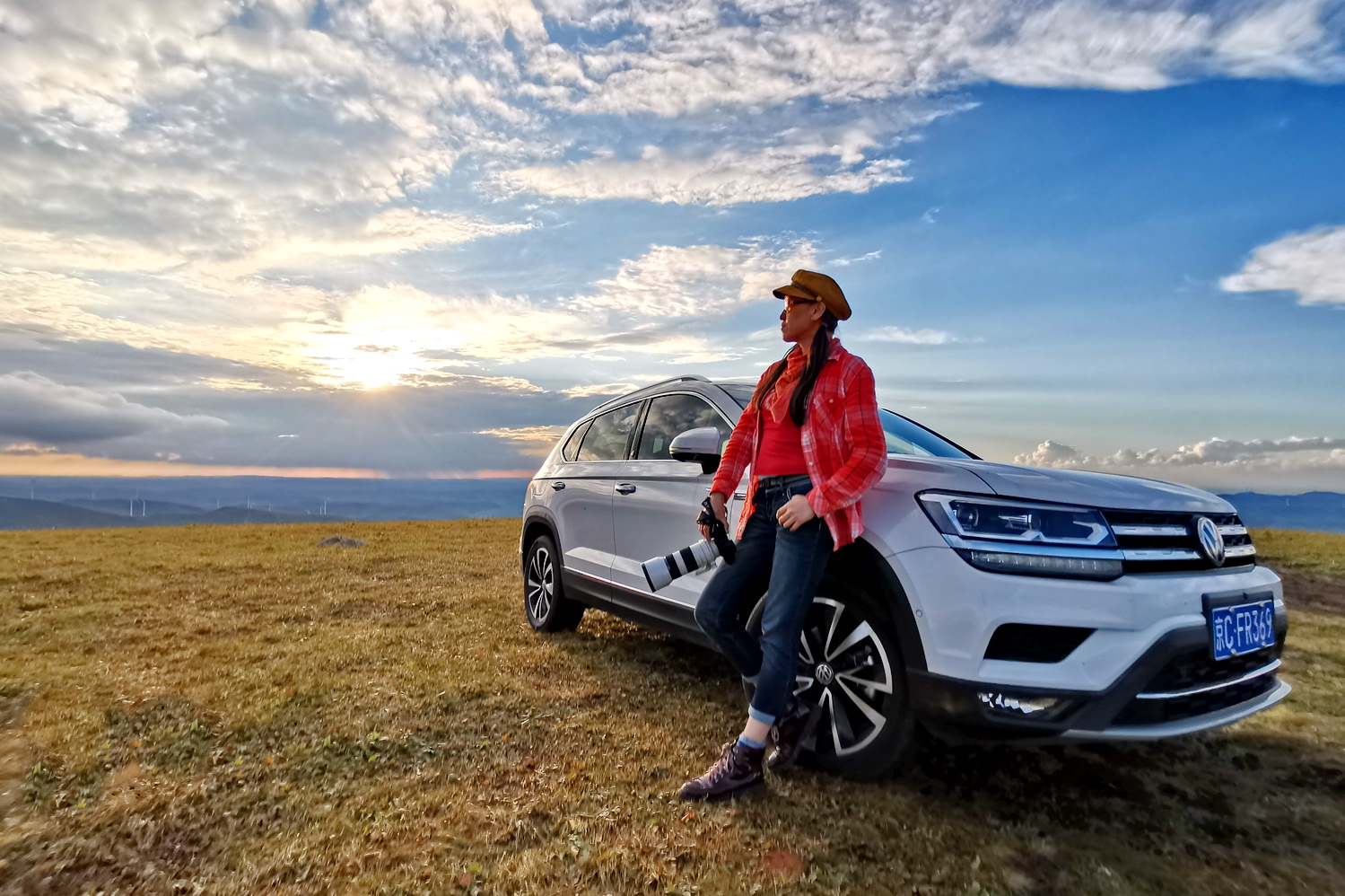 傍晚时分夕阳西下,毫无遮挡的草甸冷风四起,寒气袭人,温度骤然降到了16°。为了等待那抹最美的云霞,有备而来的我们穿上军大衣,才得以安心守候。
