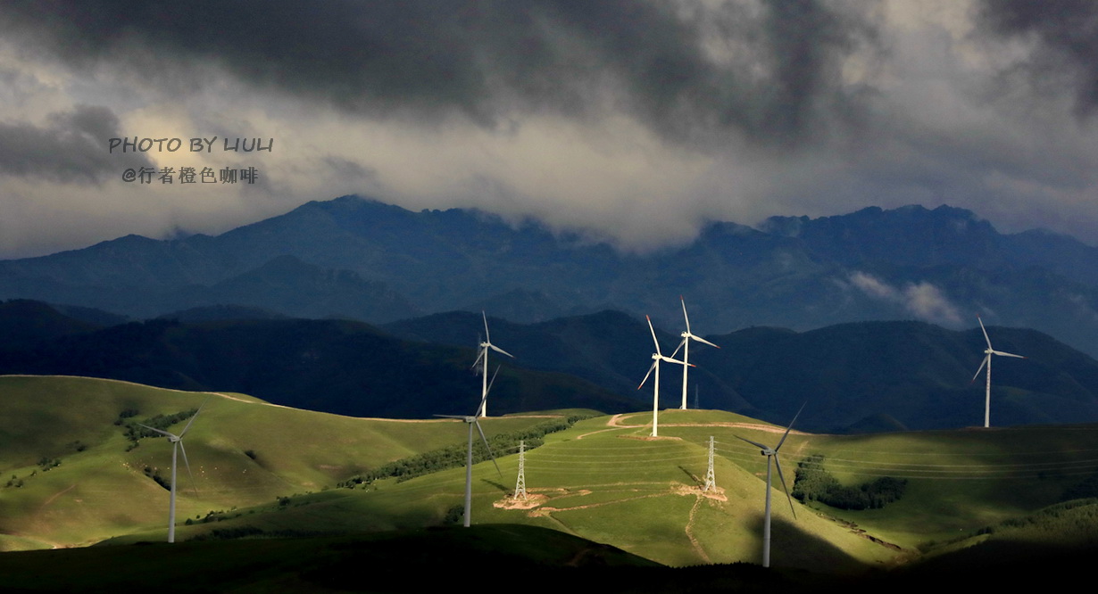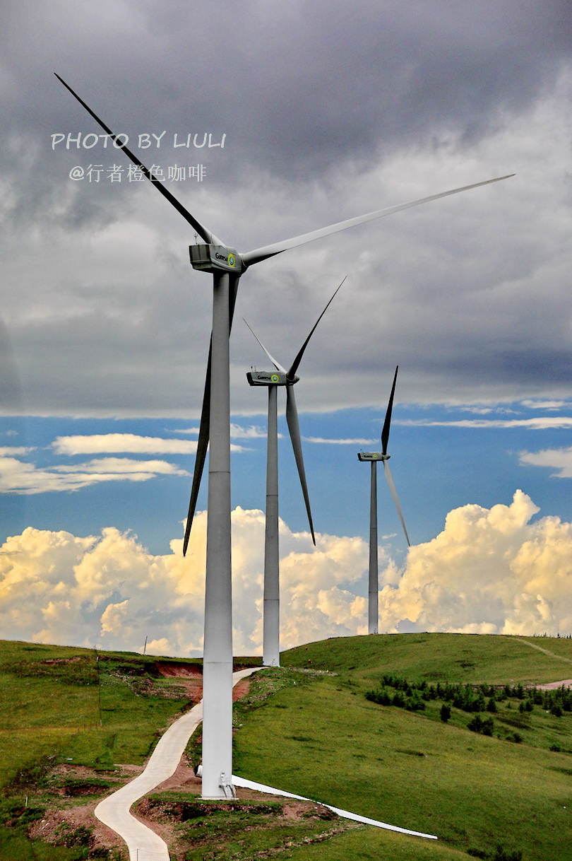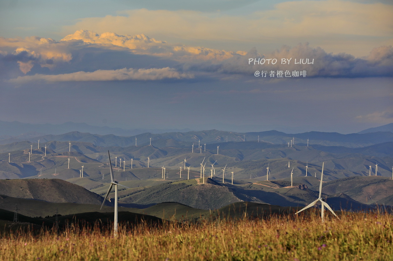 坝上独特的地理环境和气候,是风力发电的最佳之地,群山之巅布满了风车阵。高达数十米的巨型风车矗立在变幻莫测的云端,这也是天路最重要的景观之一。