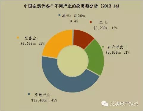 其次,中国投资者在澳洲的投资多集中在传统的投资项目,例如房地产,矿产和制造业等领域。那么除了房地产,澳洲还有哪些值得中国关注的投资产业呢? 根据FIRB的年度报告,除了传统在澳洲的投资产业例如房地产,矿产,制造业等行业外,农业,旅游业与金融行业也是许多国家投资者的热门选项。例如美国在澳洲金融行业2013-14年的投资高达12.55亿澳元,而中国在这个行业只有约5千万澳元的投资。另外,香港,美国,加拿大等国的投资者都纷纷关注了在澳洲的农业(包括水产业)的投资,而相对来说中国投资者却少有关注这个方面。