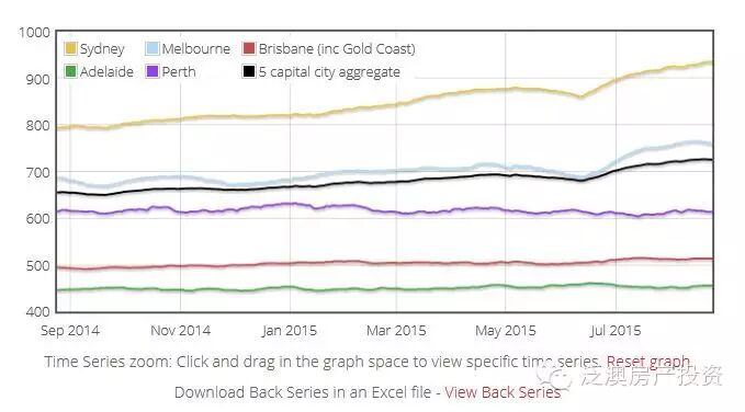 下面我们再来回顾一下从去年九月到今年七月澳洲各大城市房价的增长。从图二可看出,并不是澳洲所有首府城市的房价都在增长的。阿德莱德,珀斯和布里斯班的房价一年来几乎无变动,而带领澳洲房价上涨的领军城市的任务几乎都在悉尼和墨尔本的身上,这两大城市从整体上拉动了澳洲房价的持续增长。