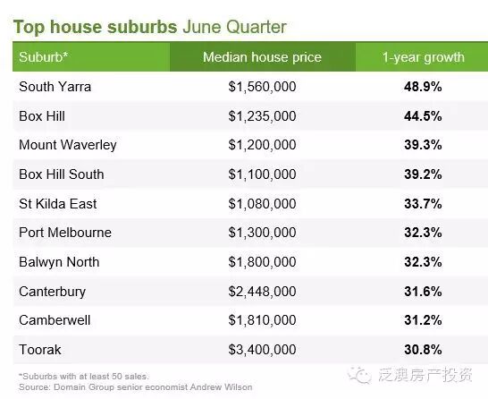 Yarra以优雅的环境常被众多买家所青睐,其涨幅高达48.9%。Toorak虽然排在榜单最后一名,但是它可称为实至名归的“富人区”,均价三百四十万澳元的情况下还可达到30.8%的年增长率。细心的读者会注意到,榜单上有九个区都在墨尔本东南,如South