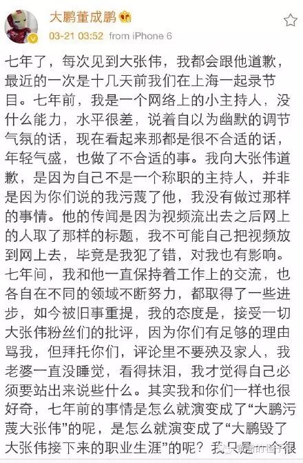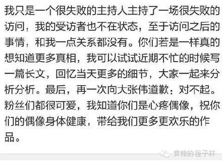 这个事呢,起因的确是大张伟不在状态,心不在焉,听力和理解能力也出了问题,导致采访无法继续,大鹏愤然离席(所以大张伟的回应中,也为不称职的被采访人道了歉)。这段视频后来被剪辑上传,上传人是大鹏当时的经纪人,这种公私难辨的身份,如果说大鹏完全不知情,也很难证明。这个事给大张伟带来的伤害,和摧毁力度,难估量。大张伟说虽然不接受道歉,但自己已经翻篇,为他打抱不平的粉丝们可以散了,旧事不必重提,和相濡以沫的相濡以沫,其他相忘于江湖,天空飘来五个字,大家开心点儿。