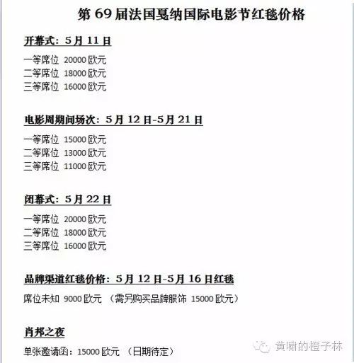 戛纳再次出现让人撇嘴的话题,是因为网上曝光了一张红毯价格单,“花钱走红毯”。曝光的清单中,详细标注了每日戛纳红毯行情价,比如开幕式一等席位开价为两万欧元,开闭幕式“媒体报道套餐”的一等席位则为四万欧元。每天的红毯票价又分为“一等座”、“二等座”、“三等座”三级,还有品牌渠道和主题晚宴的邀请函价格及具体要求。此外,还有在戛纳举行的顶级名流晚宴的邀请函价格。对号入座那些蹭红毯的陌生华人影星面孔,想必都是花了大钱的。