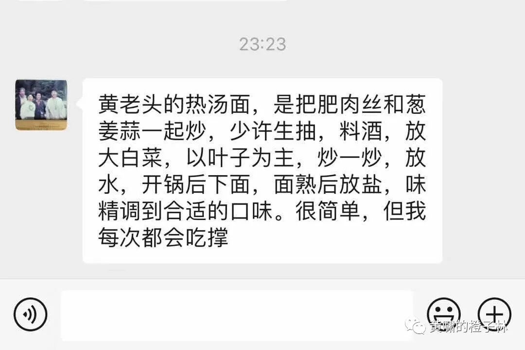 大吉今天晒了一碗西红柿鸡蛋面,上面撒了一层切碎的香菜。我说没用锅继续表扬。大吉说岂止没用锅啊,色香味了解一下。我说你都不擦擦碗边,油脂麻花就出境,中评吧。大吉再次实力话事,奠出大boss面谱把我们都镇住了——我神仙老爸的招牌热汤面:肥肉丝和葱姜蒜一起炒,少许生抽,料酒,大白菜叶子炒炒,加水,开锅后下面,面熟后放盐,味精调到合适的口味。我记得那个好吃到哭的味道了,这么简单的面,我就是还原不出来老爸厨艺的精髓。