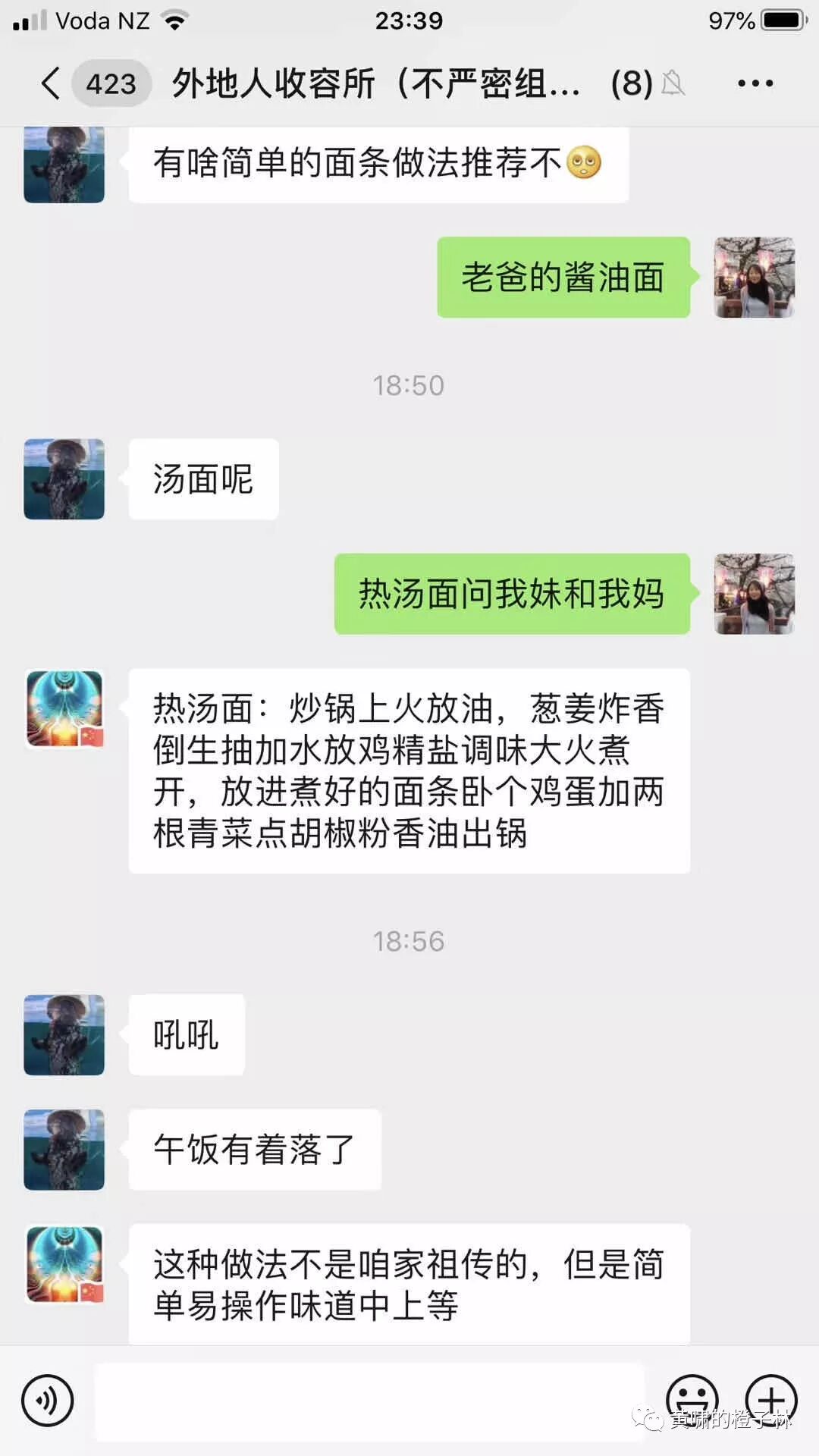 在东京的鸭子最近期末考试,昨天在群里喊了句,有什么简单的面条做法?她要火速煮碗面吃了考试去。群里人纷纷献宝,下午人早坐考场上了,这边宝还没献够呢。