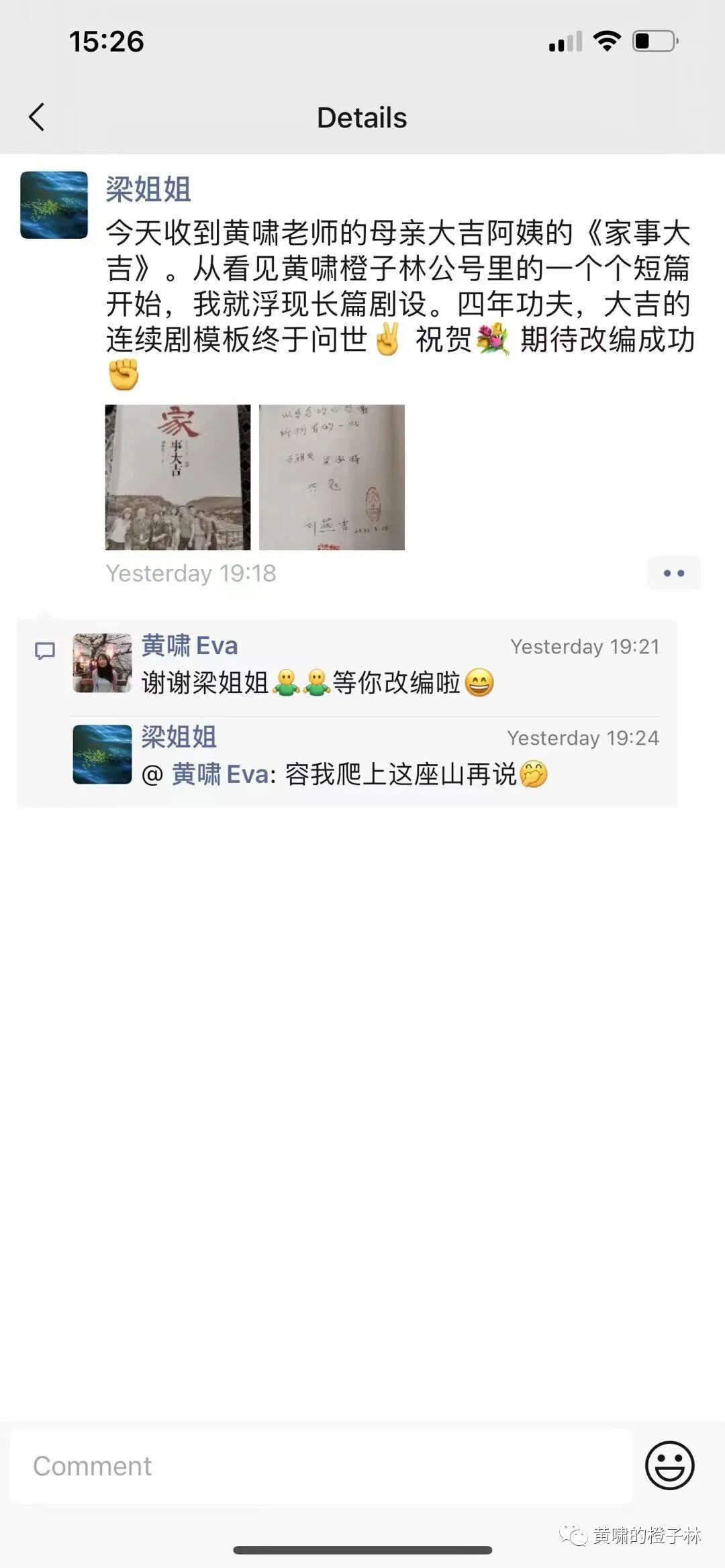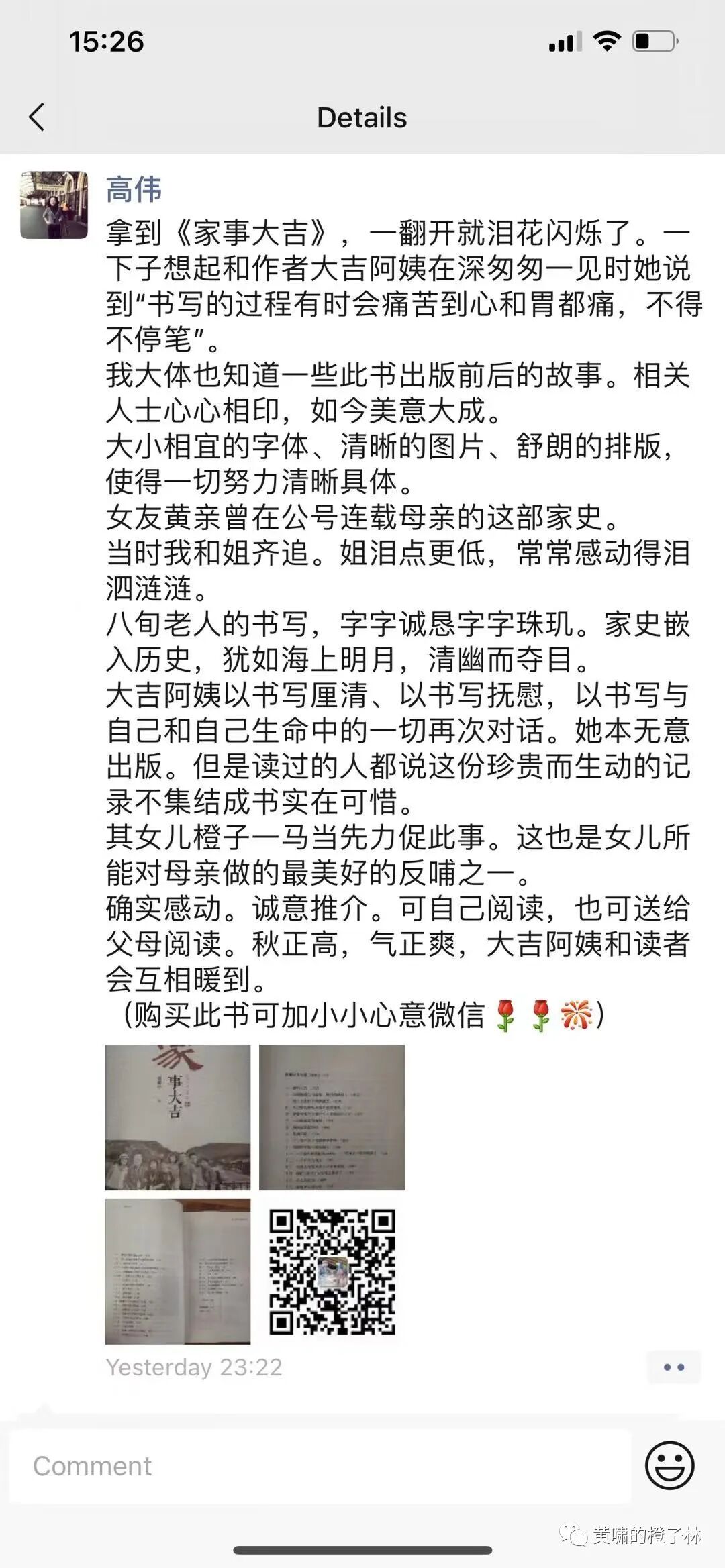 我翻着翻着,竟把已在黄啸的橙子林公号上连载时读过的文字又从头细细看了一遍。此番重读,并未征用我对大吉阿姨的敬意,也未征用我和大吉女儿黄啸(橙子)的友谊,就是因为,好看,看得我欢乐与泪水横飞。一旁的家属诧异地问我“至于吗”,我说“比至于还至于,比抵达还抵达,为其中的悲欢离合为其中的情真意切。”
