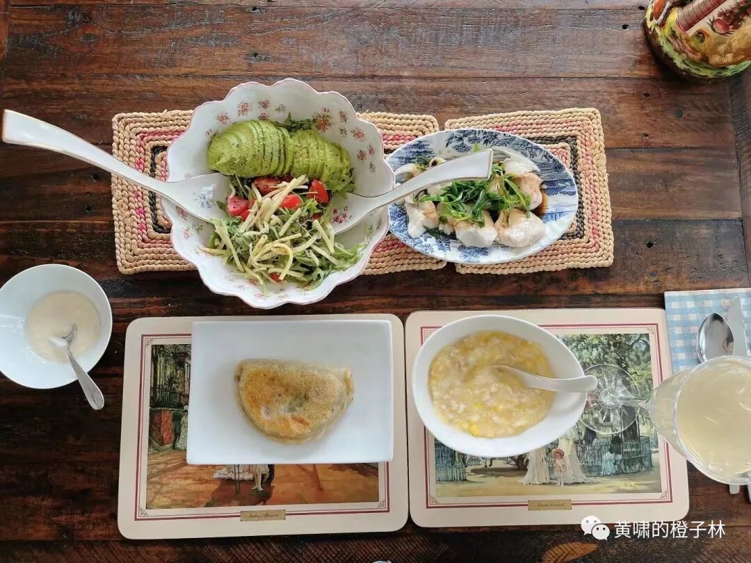 清蒸鱼腩&牛油果芝麻菜沙拉&杂粮粥&韭菜盒子