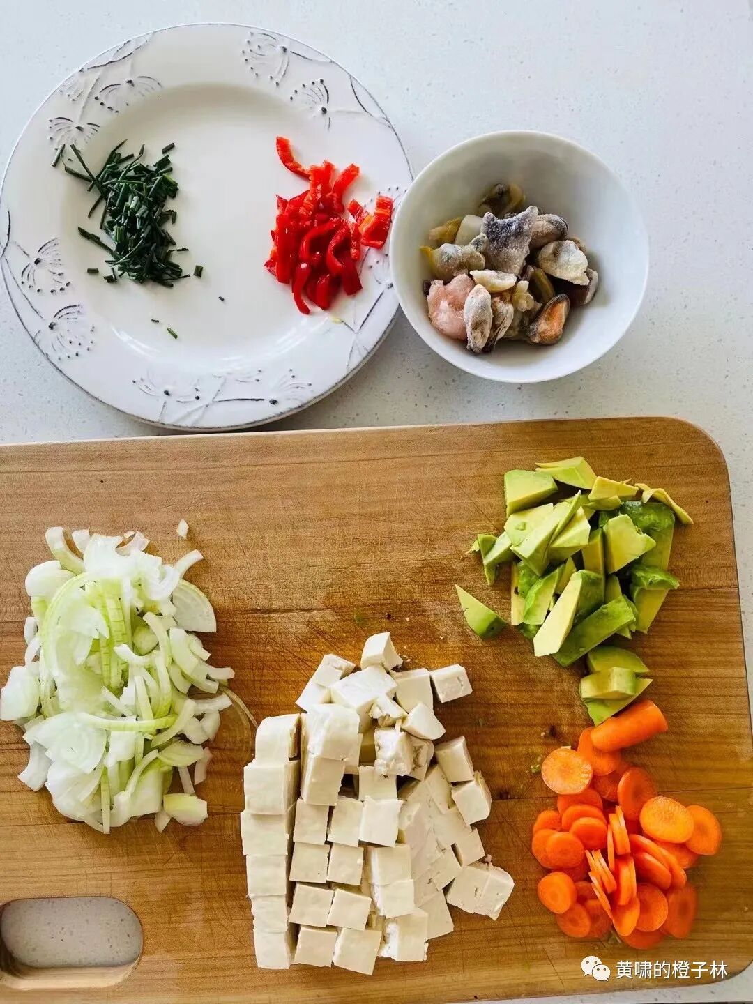 海鲜粒豆腐煲&咸蛋黄炒小瓜&杂粮粥&烤红薯(没肚子吃了)同时烘焙了榛子。