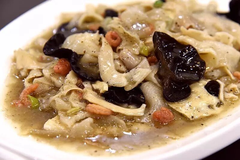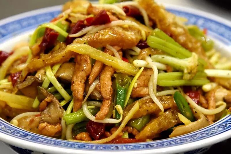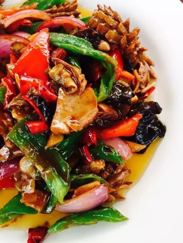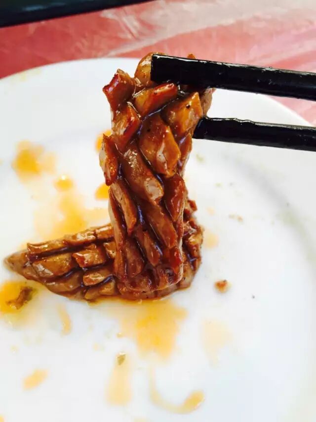 这绝对是考验厨师刀工手法的一道菜,密密的花刀,不能深,不能浅不能大不能小。周刘柱说,切好的腰花应该是浇上一遍热油后打卷儿的,一遍油,一遍料汁儿,配上青红椒,木耳,翻炒翻炒,出锅,多一秒嫌生,少一秒嫌硬,就爱这大火翻炒后烟熏火燎的味道。打卷儿的腰花包裹着深褐色的料汁儿,还有碎碎的胡椒粉,微辣,微甜,微咸微酸,你必须试试。