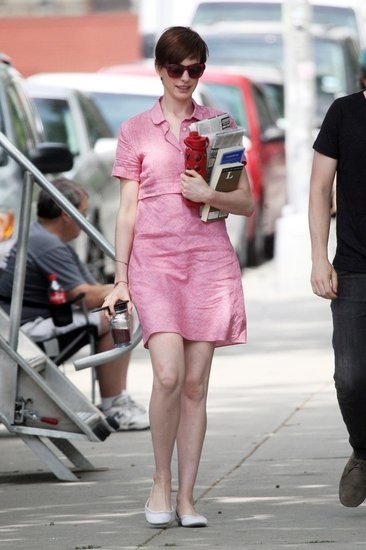 安妮·海瑟薇粉色连衣裙现身《第一支歌》片场,手捧报纸书籍变身文艺女青年。
