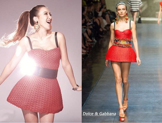 Dolce & Gabbana2013春夏这个系列富有浓烈的凡尔赛风格,彩色装饰腰带、耳环等配件丰富了舞台效果。李玟选择的这款廓形编织吊带短裙本身就已经很富有看点了,去掉那些繁复的装饰,反而更加大气。