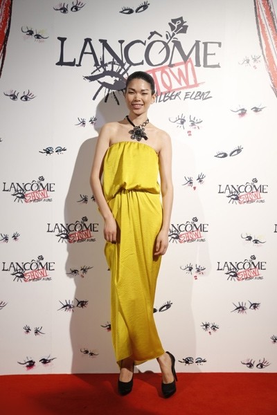 这位时尚辣妈出席活动身穿的亮黄色缎面抹胸连衣裙很是亮眼,黑色的项链和高跟鞋上下呼应,潮味十足!