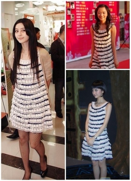 花边裙甜美俏丽,不过王珞丹穿上有点显皮肤黑,景甜的假发有点怪,还是范冰冰演绎得完美。