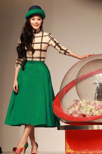 为某品牌眼镜品牌站台,范冰冰着格子衫搭配绿色复古长裙,再配上一顶可爱的绿色小礼帽,充满少女校园气息,小清新的造型完美减龄,加上彩色高跟鞋和俏丽卷发完美打造清纯洋溢的复古造型。