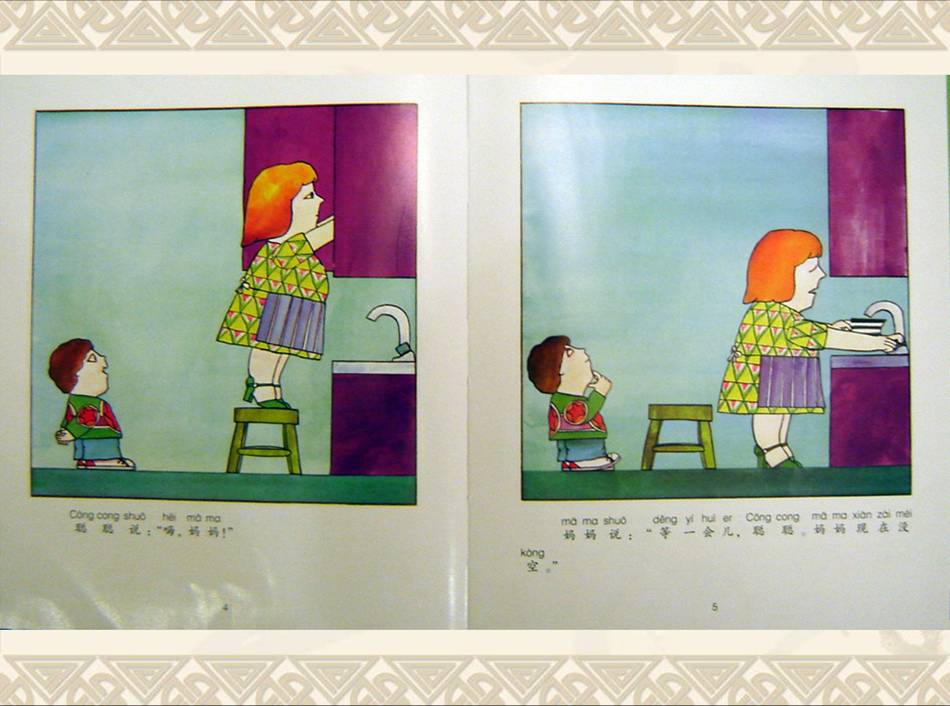 聪聪只好去找妈妈,看见妈妈正在橱柜打扫卫生,就说:“嘿,妈妈。”
