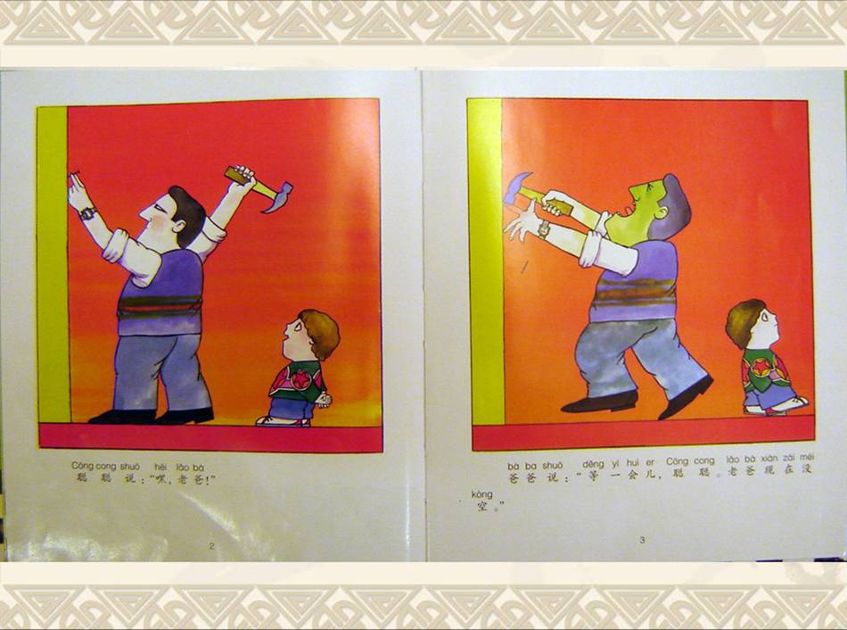 老爸一慌,不小心砸着了自己的手指,脸痛得铁青,他没有很生气也没有回头便说:“等一会儿,聪聪。老爸现在没有空。”