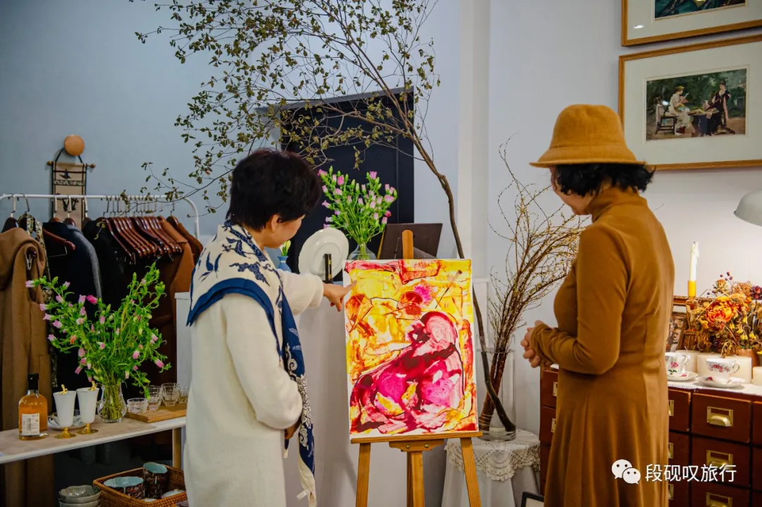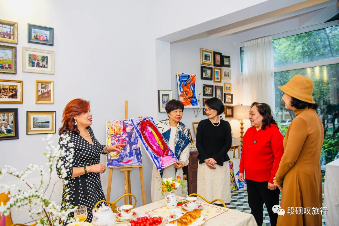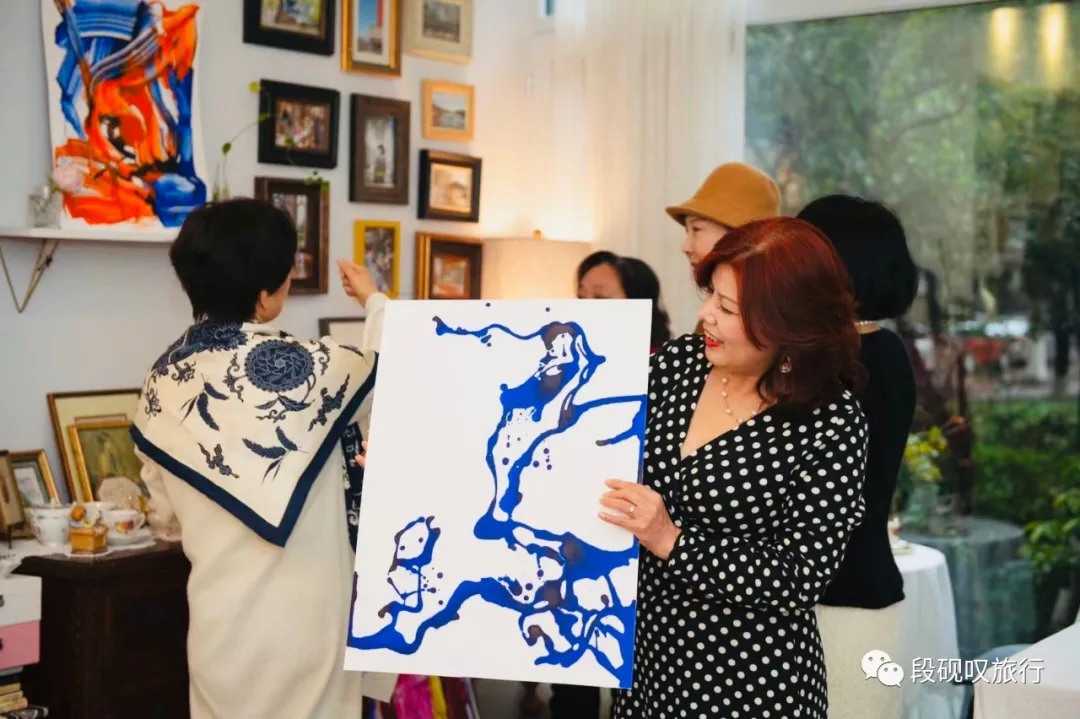 同样多次参加过“结伴趣旅行”最近也在学画画和书法的高老师,和她的朋友媛媛姐,来自华中科技大学两位英语教授Linda Lee老师和GraceYu老师,都爱好艺术,大家围绕画作相谈甚欢。