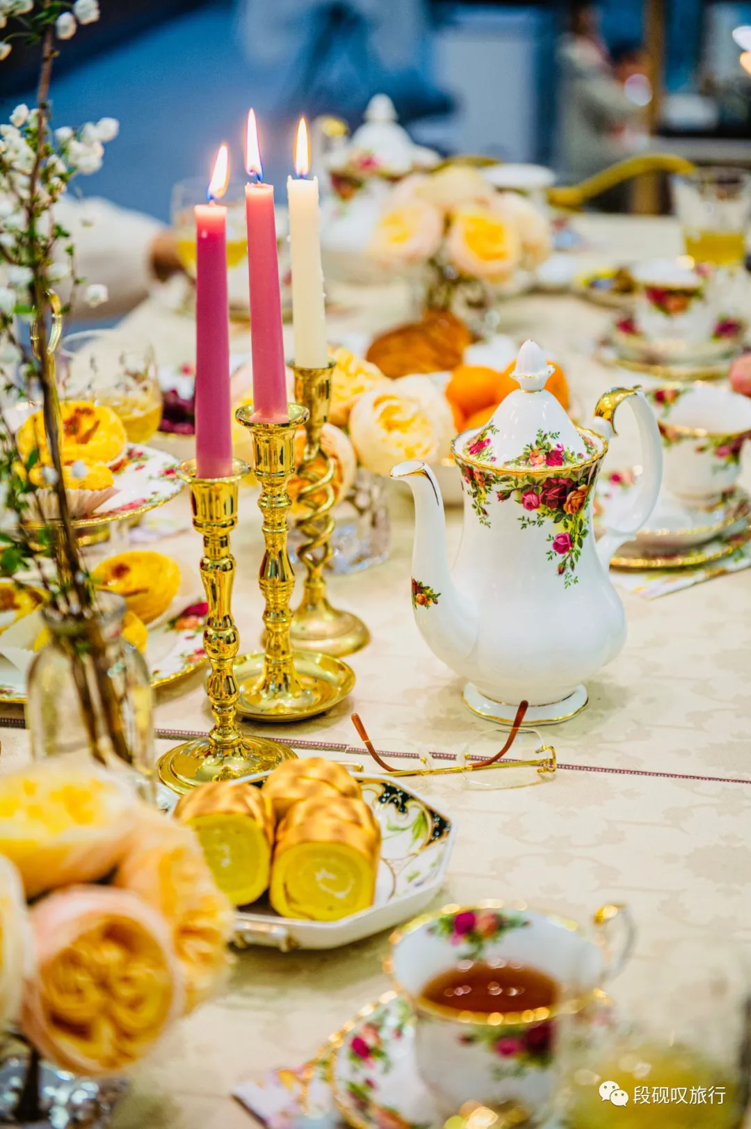 一人临时操办聚会,来不及准备太多,提前一天选好要用的餐具,英国皇家阿尔伯特老镇玫瑰系列杯碟碗盘,到花市采购鲜花,简单布置餐桌。