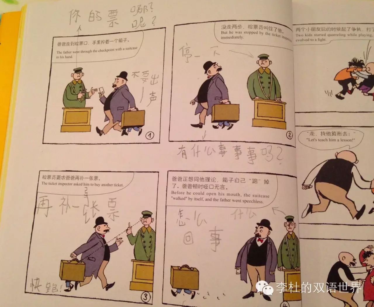 二,暂时放弃刻板写字训练,利用教学技巧,引导心一主动写字。比如今晚,利用心一喜欢破坏、喜欢无厘头的特点,让心一在这书上乱写,自己加上旁白。一直不喜欢写字的心一,一时竟不肯歇手了。