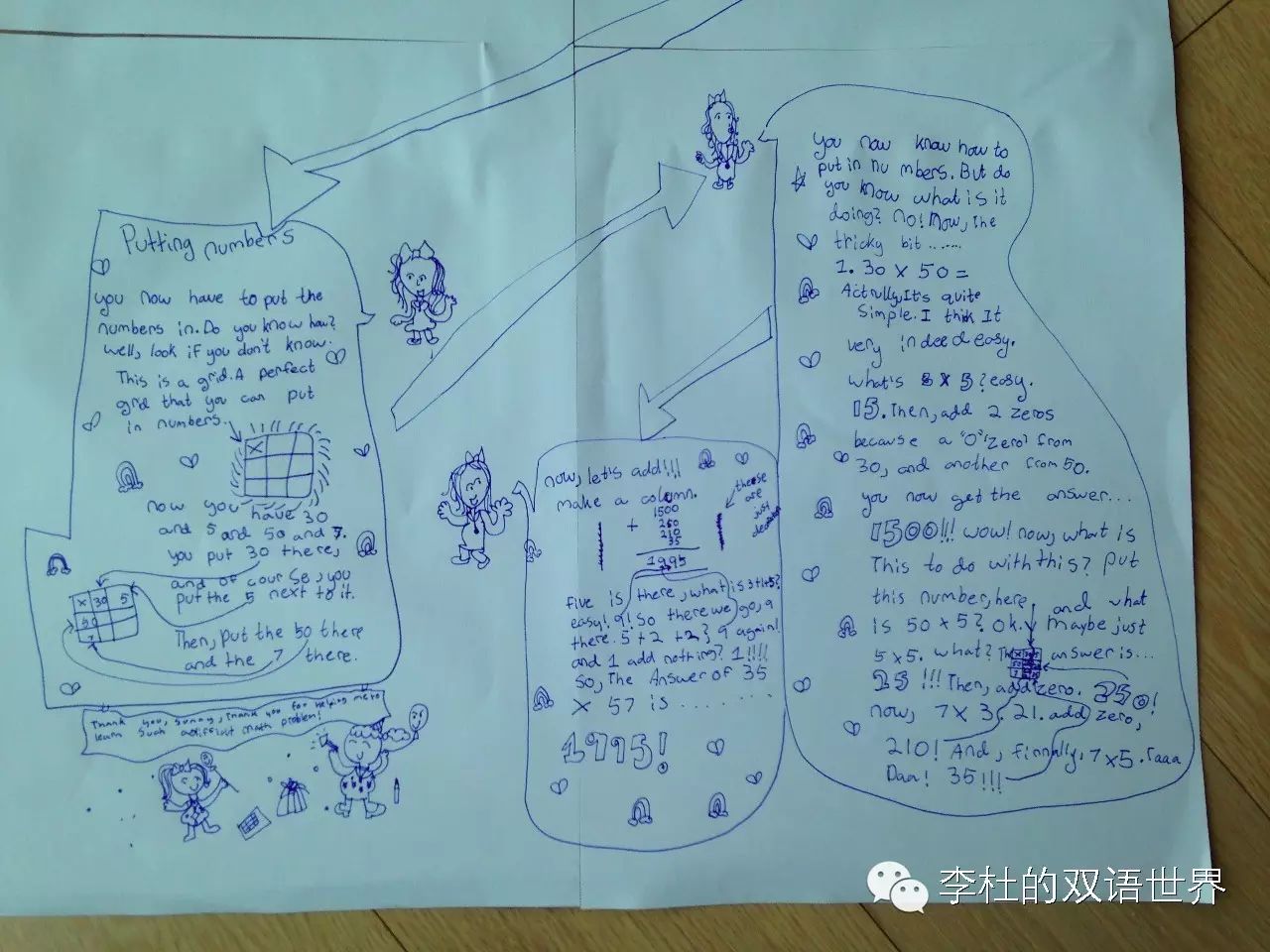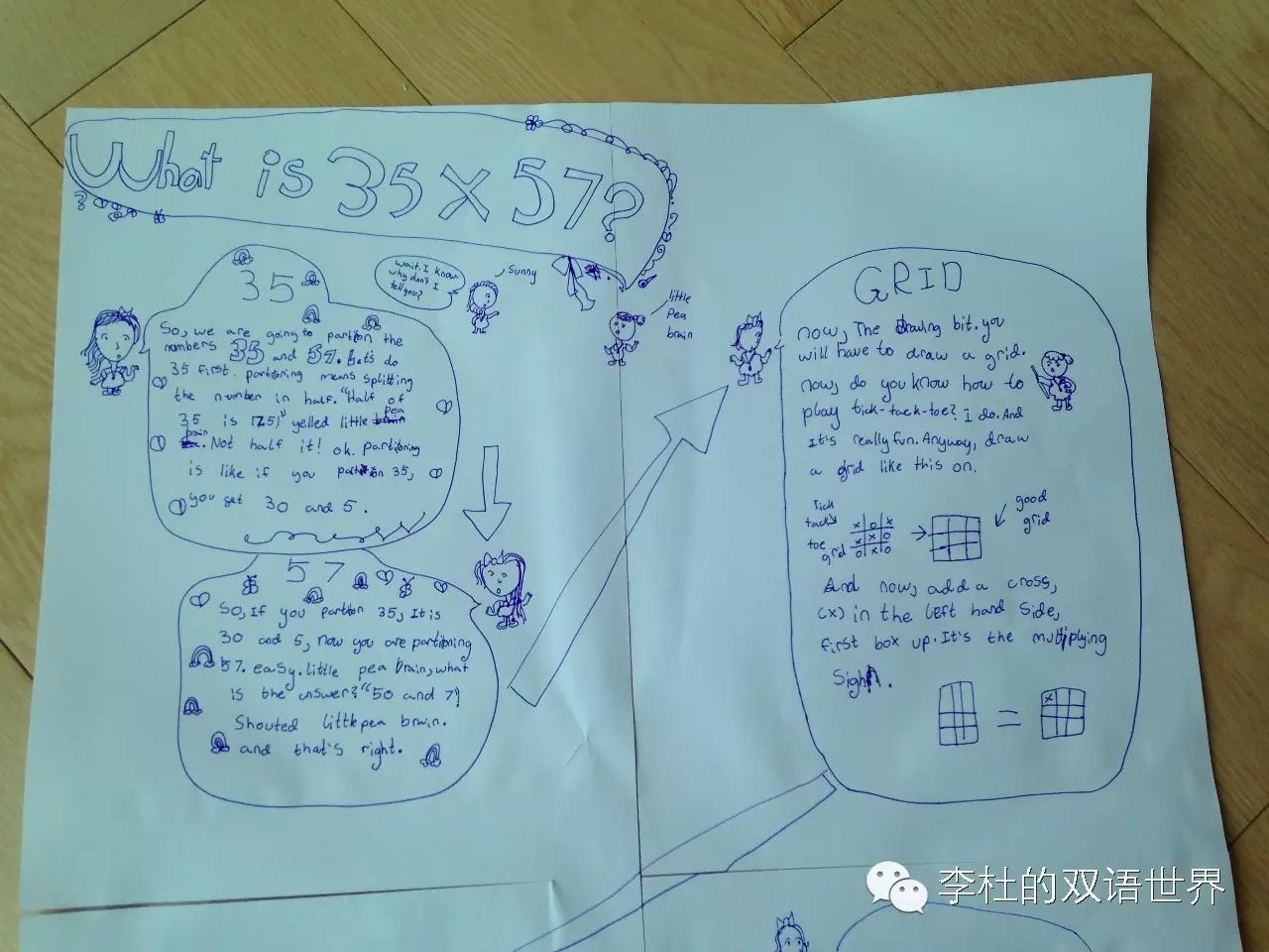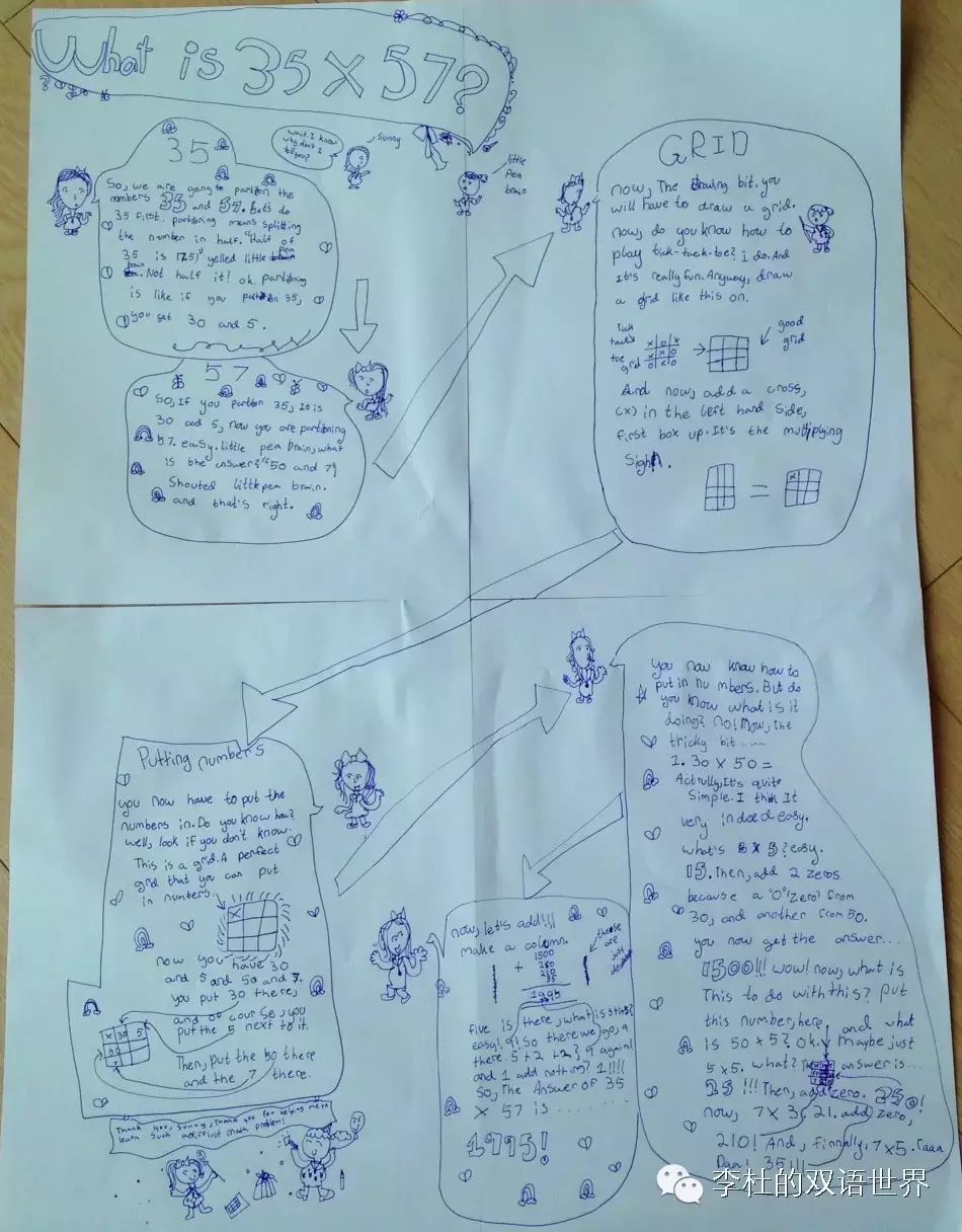 四大张A4的纸,都不够心一讲明白一道乘法题。中间额外加了一个小框,总算得出结果,1995!意犹未尽,又在左下角空白处,画了一幅庆祝场面。little Pea Brain小笨蛋说,”Sunny,谢谢你帮我解决了这么难的问题!”