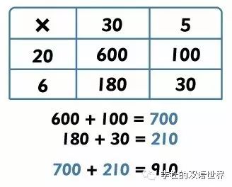 心一她们学的数学乘法,用表格的形式,把算数的每一过程分解,我闻所未闻,哑然失笑,却颇长见识。效率低,但重点在过程,培养数学思维。比如35乘以26,如下: