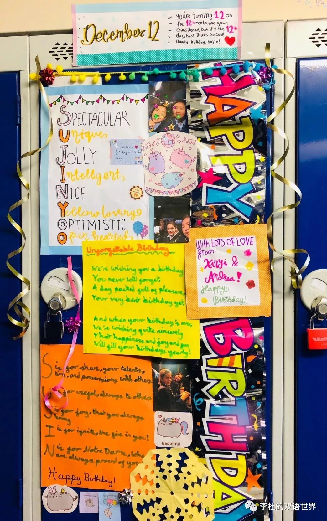 按照惯例,同学们到校,把书包放在储物柜里,见到被装饰的柜子,就知道谁过生日。生日主人进来,大家便鼓掌庆祝,暖意融融。