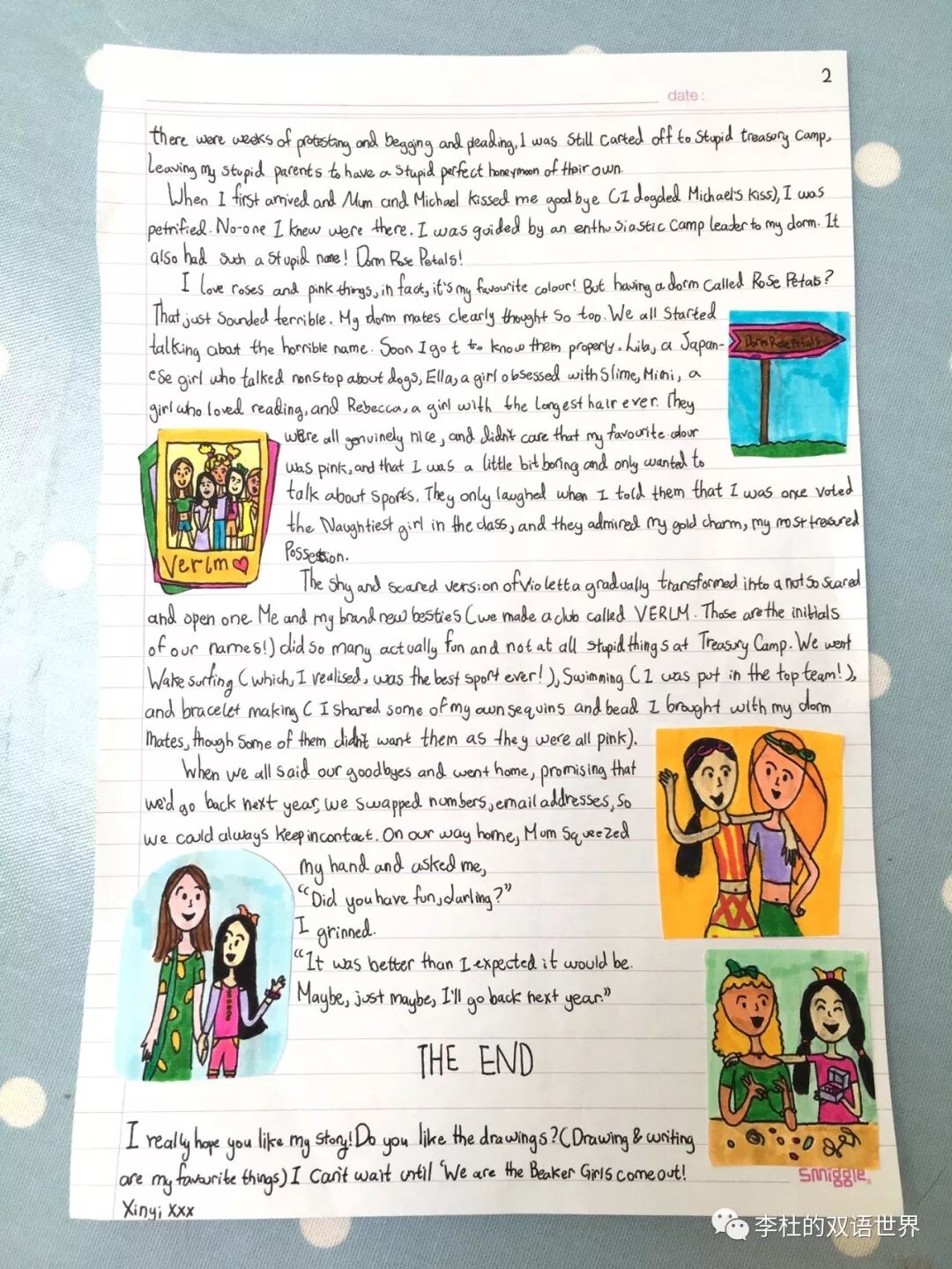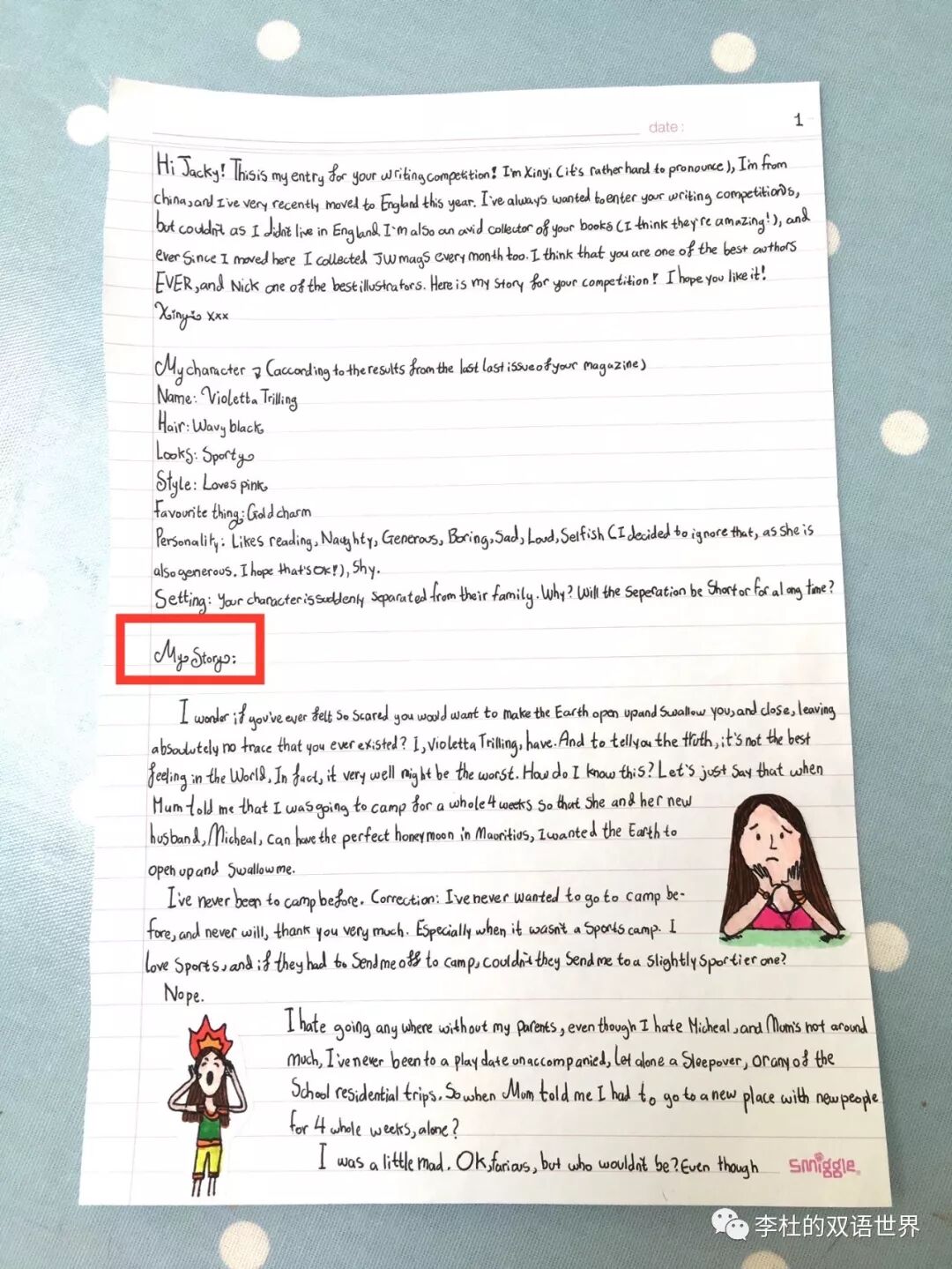 于是,心一的小说题目,就成了My Story。有点像唐诗里的“无题”,或“口占一绝”。心一还为自己的小说配了图,采取Jaqueline Wilson作品里插图师Nick Sharratt的风格,几乎可以乱真。