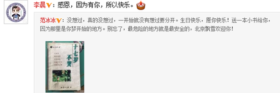24日凌晨,范冰冰在微博晒出给李晨过生日的一组照片,李晨、范冰冰两人合捧鲜花,桌上也摆着有两人卡通形象的蛋糕。范冰冰发文祝李晨生日快乐,“生日快乐!你要快乐! ”
