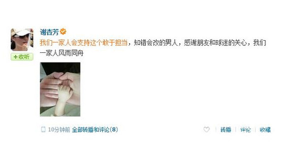 林丹出轨事件曝光后,谢杏芳第一时间选择原谅了丈夫,她在回应中写道:“我们一家人会支持这个敢于担当,知错会改的男人,感谢朋友和球迷的关心,我们一家人风雨同舟!”